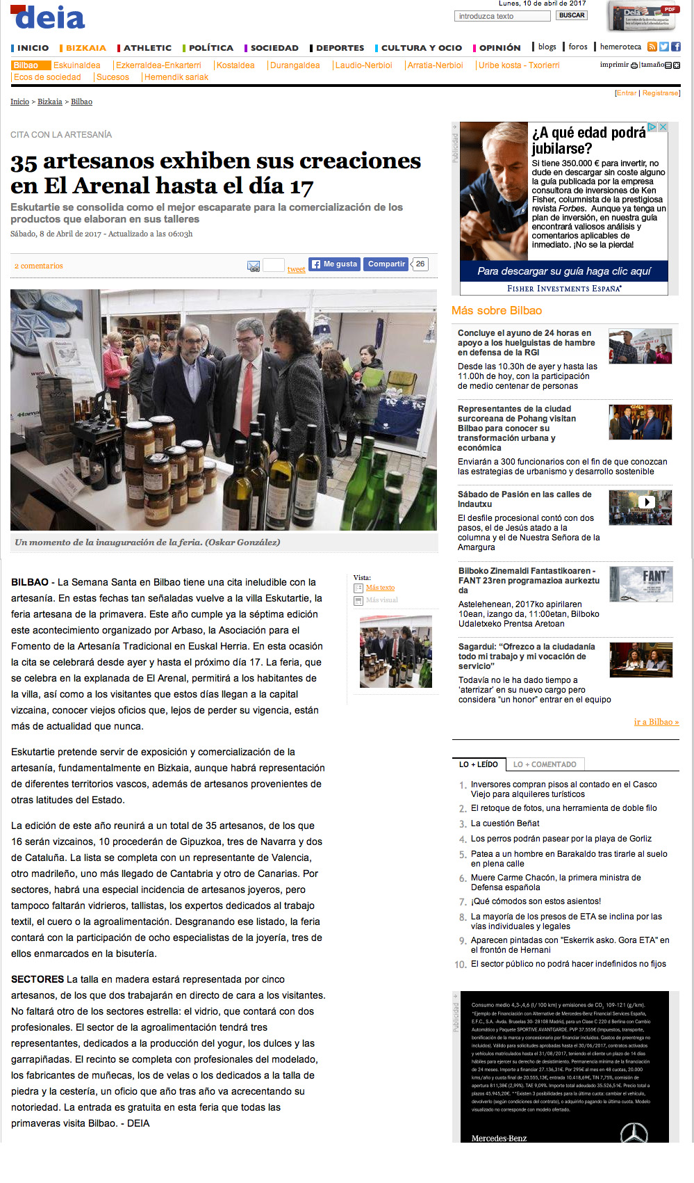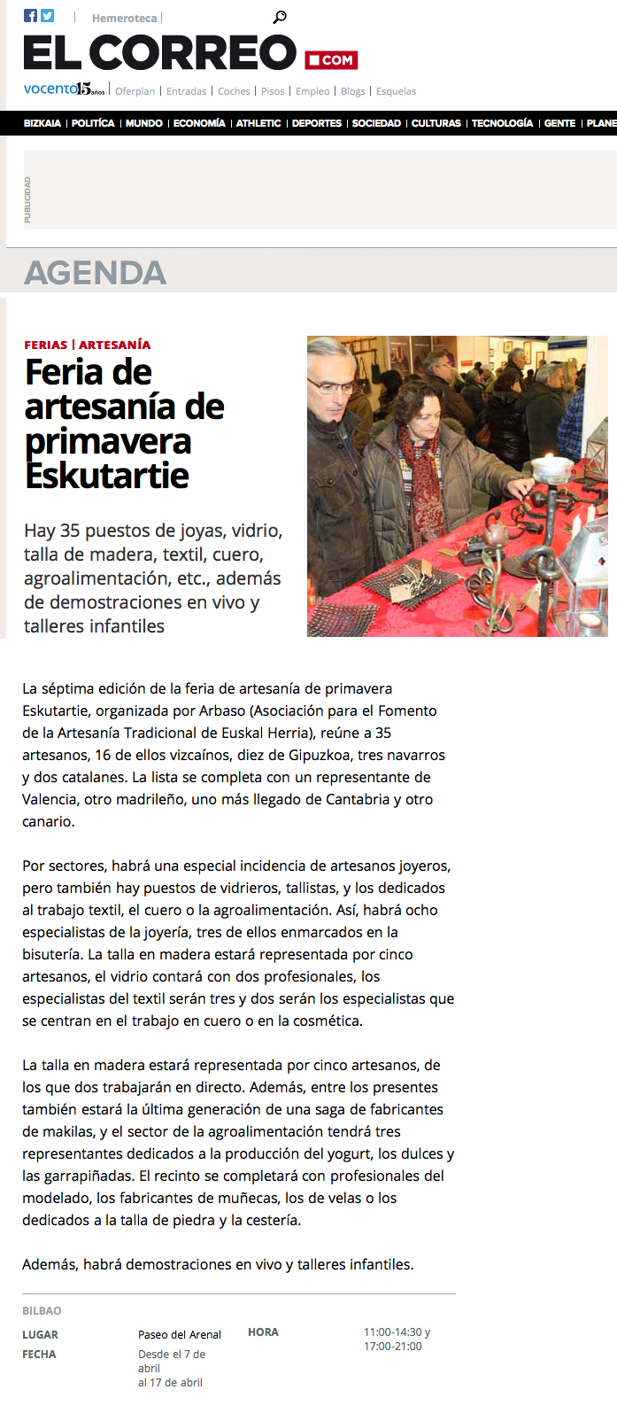 Artisau agurgarriak: martxoaren 23etik apirilaren 3ra egingo da Bilbon Udaberriko VI. Azoka, Eskutartie. Opor sasoietan jende asko etortzen da Bilbora, munduko edozein lekutatik, hango kulturaz, hirigintza berrituaz, gastronomiaz eta hiriaren abegi onaz gozatzeko. Aukera ezin hobea da gure artisau-lan profesionala ezagutzera emateko eta produktua saltzeko. Arbasotik, berriro ere, ahalegina, maitasuna eta profesionaltasunaz baliatuta, merkaturatzeko ekitaldi berria aurkezten dizuegu.