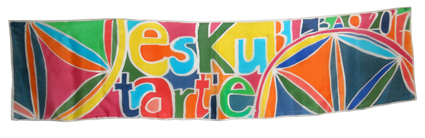 Y una actividad ya habitual en nuestras ferias es la de pintar un pañuelo de seda entre todos los que lo deseen, y aquí tenemos a Aziza Puch de Meano (Nafarroa) haciéndonos sentir a todos un poquito artesanos y artistas, este año el tema es como no podía ser de otra forma , Los días europeros de la artesanía.