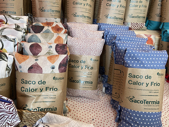 Josune Uriarte de Dima ya se ha hecho habitual en nuestras ferias, hace fajas lumbares, mantas compartimentadas, antifaz, zapatillas y saco cervical todo para su uso en caliente o en frío.