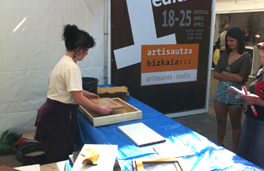 Hoy es el turno de Marian, una artesana de Abadiño que se dedica al grabado artístico sobre papel reciclado. La pudimos ver durante toda la mañana y toda la tarde en Eskutartie. Marian nos enseñó toda la elaboración del papel reciclado: poner a remojo papel troceado durante varias horas y batirlo con la batidora para generar la pulpa; a continuación, vamos introduciendo la pulpa en un recipiente con agua para recogerla después con un bastidor. Para darle forma a la hoja, ponerle sobre el bastidor un marco con la forma deseada. Con una bayeta absorbente se recoge la hoja del bastidor, para poderlo colgar posteriormente para su secado, que puede tardar varios días según las condiciones ambientales.