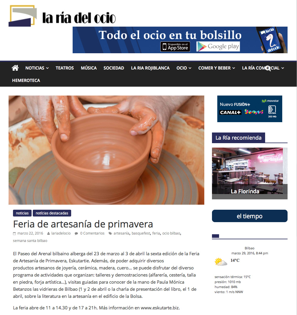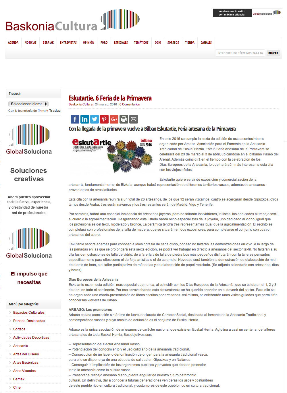 Artisau agurgarriak: martxoaren 23etik apirilaren 3ra egingo da Bilbon Udaberriko VI. Azoka, Eskutartie. Opor sasoietan jende asko etortzen da Bilbora, munduko edozein lekutatik, hango kulturaz, hirigintza berrituaz, gastronomiaz eta hiriaren abegi onaz gozatzeko. Aukera ezin hobea da gure artisau-lan profesionala ezagutzera emateko eta produktua saltzeko. Arbasotik, berriro ere, ahalegina, maitasuna eta profesionaltasunaz baliatuta, merkaturatzeko ekitaldi berria aurkezten dizuegu.