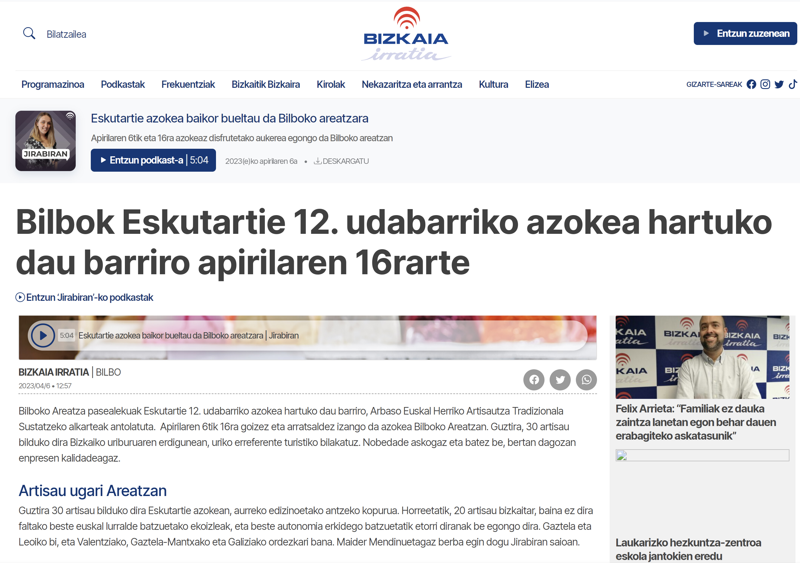 Eskutartie, Bilboko Udaberriko Azokaren 12. edizioa, apirilaren 6tik 16ra Areatza Pasealekuan. Arbasok artisautza-sektorearen zerbitzura jarri duen merkaturatze-tresna, profesionalen artisau-produktuak ezagutarazteko eta horiek saltzeko. Ekimen honetan parte hartzen dute Bilboko Udalak, Bizkaiko Foru Aldundiak, Radio Popularrek, Onda Vascak eta Basque Festek.