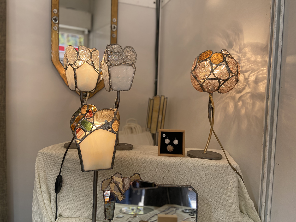Pieza horiek, funtsean, beiraz egiten dituzte, eta piezak kobrezko zintaren edo tiffanyaren teknikaren bidez lotzen dituzte.