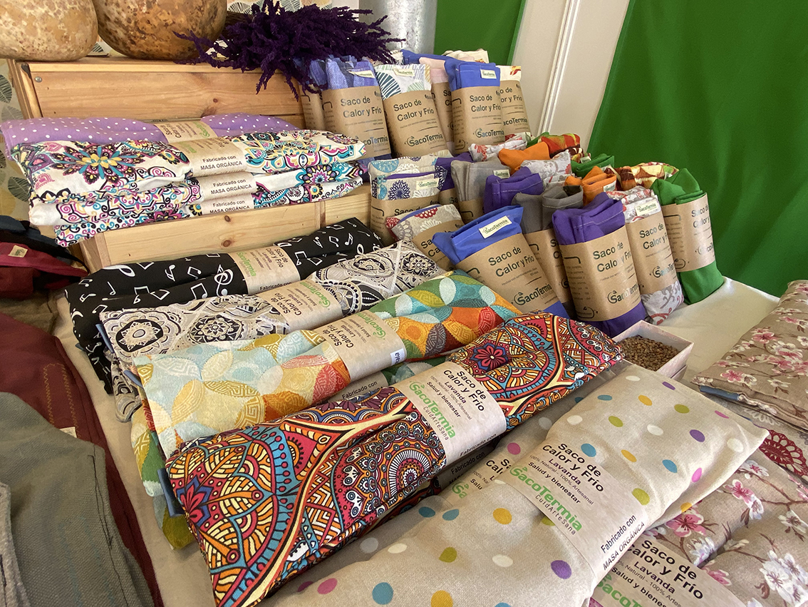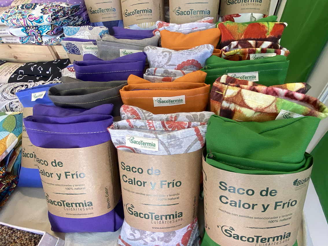 Josune Uriarte de Dimak gerrialdeko zerrendak, manta zatikatuak, antifaza, zapatilak eta zaku zerbikala egiten ditu, guztia beroan edo hotzean erabiltzeko.